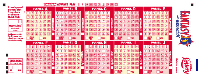 To play, pick up a FANTASY 5 playslip at an authorized Florida Lottery retailer. Each playslip contains 10 panels (A-J). In each panel played: 1. Select five numbers from 1 through 36 or mark the Quick Pick box to have the computer pick any or all of your numbers at random. 2. For a chance to win cash instantly, select the EZmatch™ box in a panel for a $1 more per play. Or you can mark the EZmatch box on the upper left side of the playslip to add EZmatch to all panels played. FANTASY 5 tickets with EZmatch cannot be canceled. 3. To play the same numbers for more than one draw, simply tell the retailer how many advance draws you wish to play or select the number of draws in the Advance Play section of your playslip. 4. Give your completed playslip and payment to the retailer. You will receive a ticket printed with your numbers, draw date(s) and the total cost of the ticket. For each panel with EZmatch selected, you will receive a separate ticket with your FANTASY 5 and EZmatch numbers. Please check your ticket(s) before you leave the store. You are responsible for the accuracy of your ticket(s).
